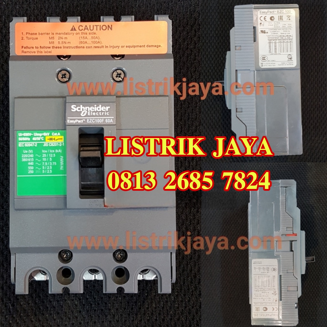 - MCCB 60A 3 Pole 10KA EZC100F Schneider ( 15A 20A 25A 30A 40A 50A 60A 75A 80A 100A ), EZC100B 7,5KA ( 15A 20A 25A 30A 40A 50A 60A, EZC250F 18KA ( 100A 125A 160A 200A 225A 250A ), Dan Varian Terbaik Easypact CVS 25KA Dan 36KA Tipe TM Dengan Isi 3P Dan 4P ( 190A 300A 400A 500A 640A 800A 1250A 2000A 2500A ).